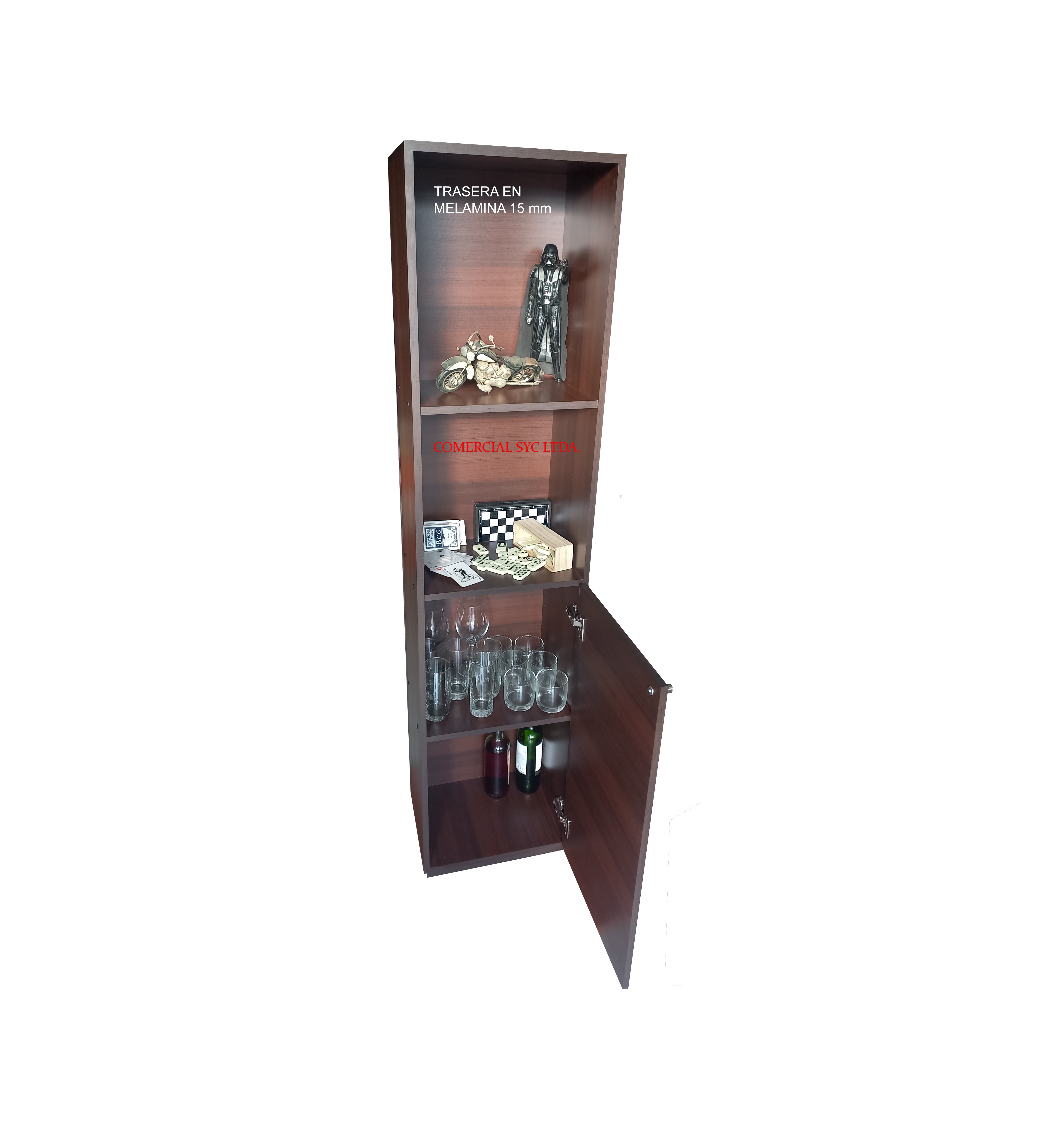 Mueble completamente solido ya que la trasera está fabricada del mismo material de las puertas repisas y costados, en melamina color wengue 15mm 500 ciclos.