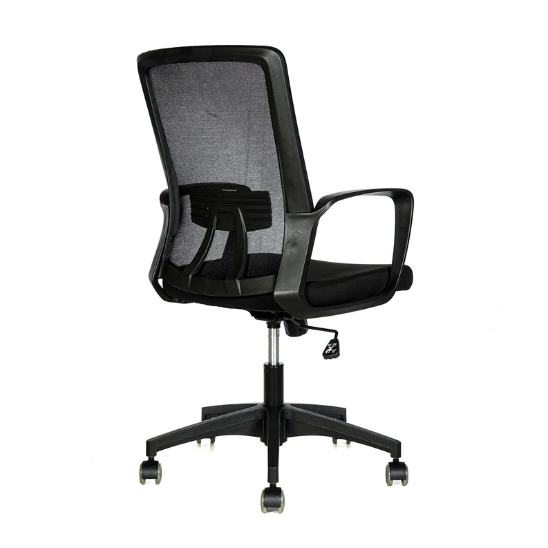 Silla de estructura negra con respaldo en malla color negro y asiento tela negra con