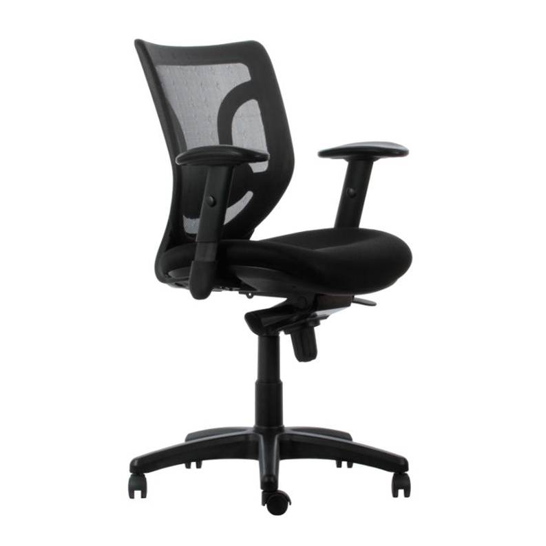 manual, asiento de espuma de alta densidad tapizado en tela negra, brazos regulables en